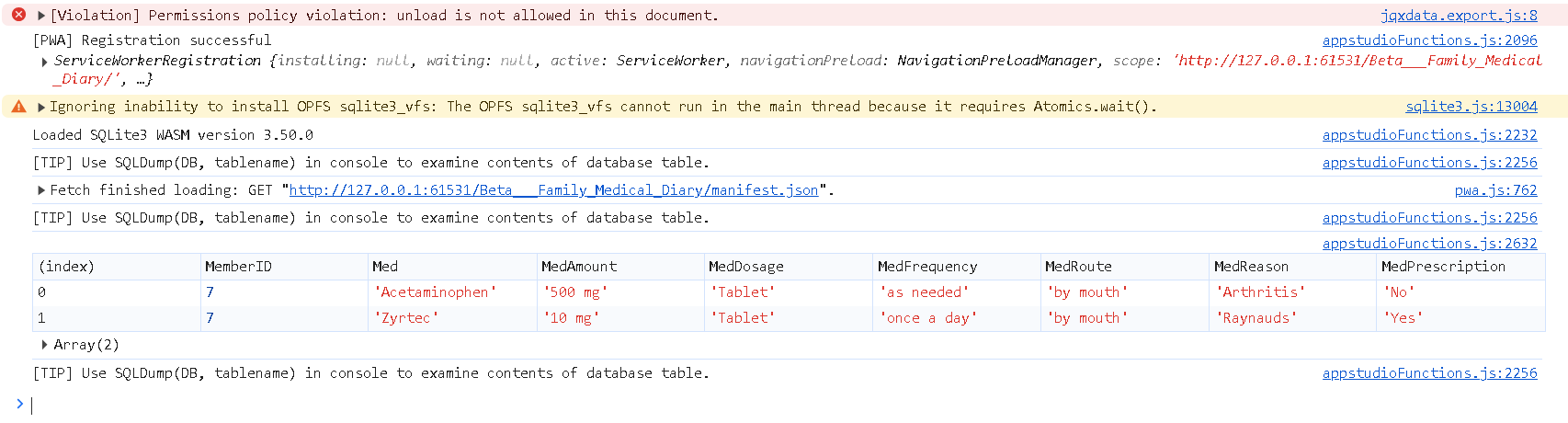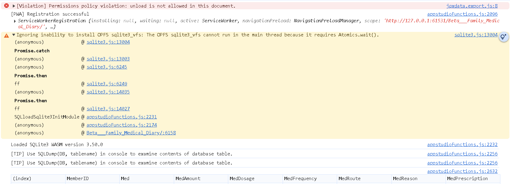 Ignoring inability to install OPFS sqlite3_vfs: The OPFS sqlite3_vfs cannot run in the main thread because it requires Atomics.wait().